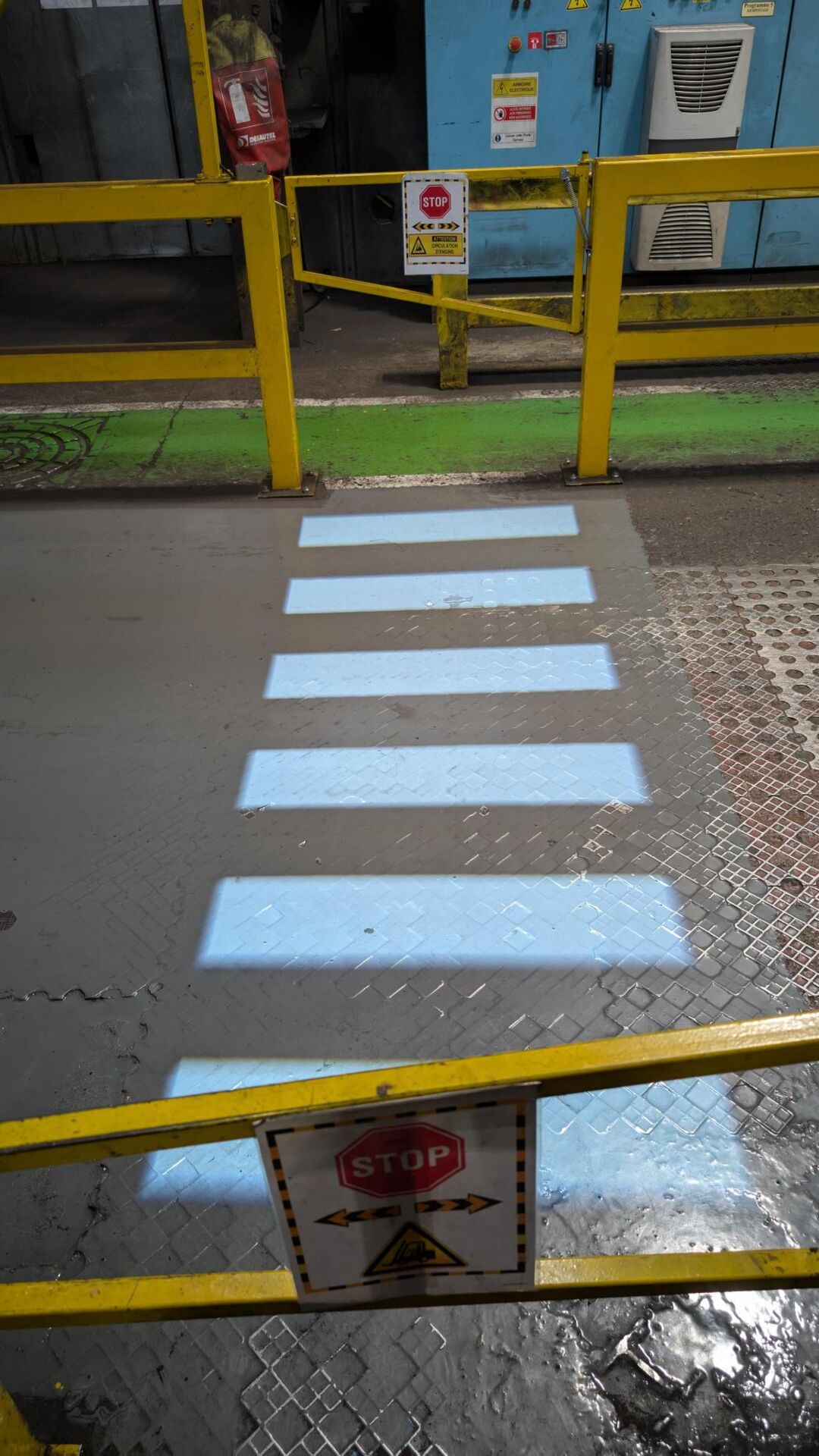 L’installation a été réalisée en tenant compte des contraintes techniques du site : hauteur sous plafond, type de revêtement, exposition aux vibrations et aux flux de circulation. Les points lumineux projetés au sol permettent une alerte visuelle immédiate, renforçant la sécurité des opérateurs et la gestion des flux piétons.